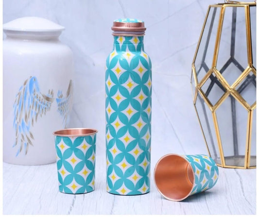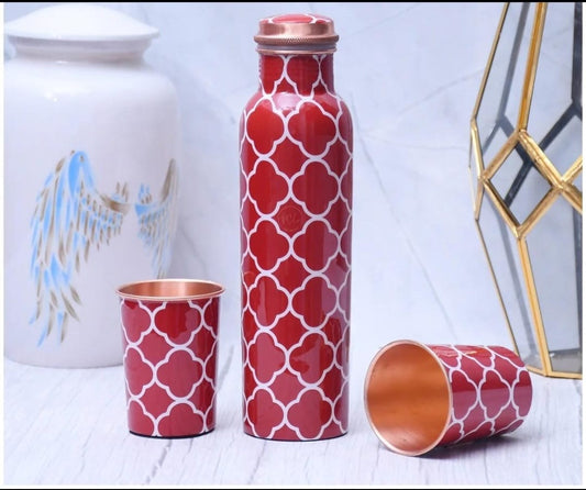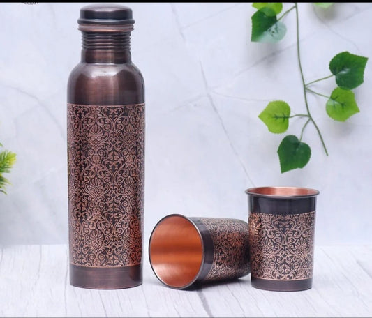 Traditional Indian Pattern Design - 100% Pure Copper Bottle Set with 2 Glasses